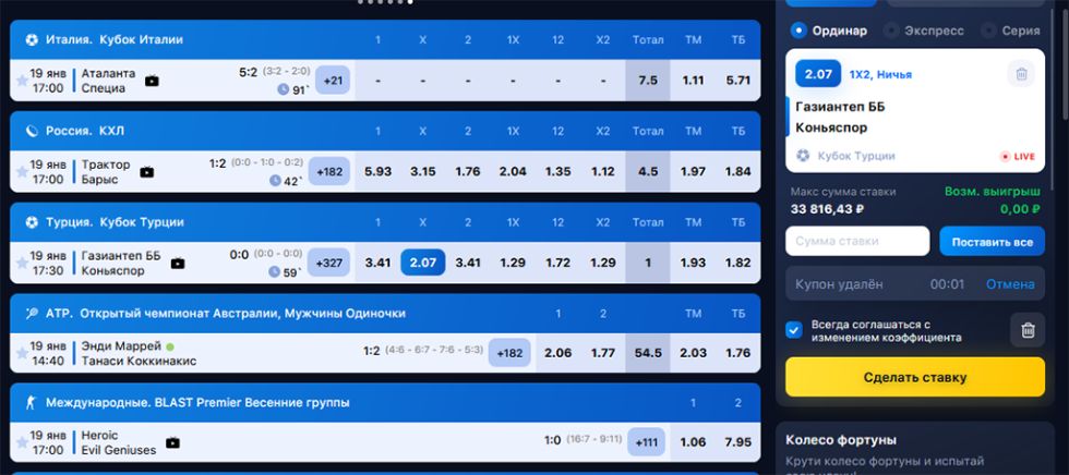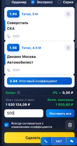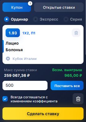 Чтобы сделать экспресс-ставку, вам нужно добавить в купон минимум две ставки. После этого купон автоматически превращается в экспресс.