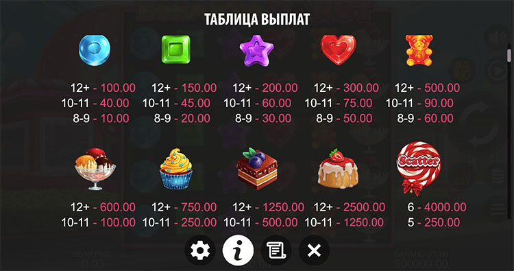| Леденец (Scatter) | 150 | 250 | 4000 | - | - | - |