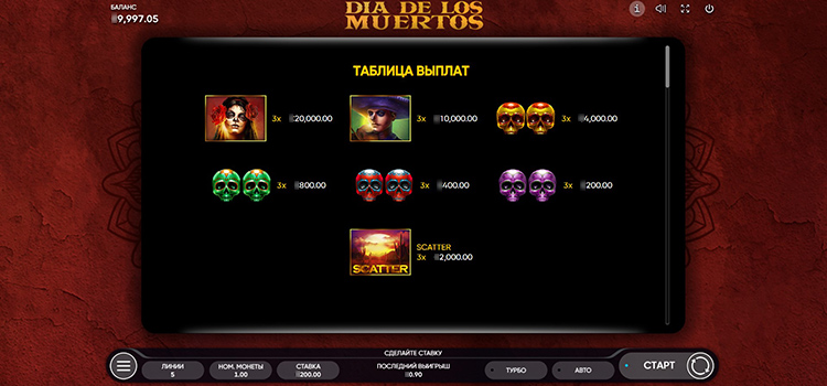 Таблица выплат Dia de Los Muertos