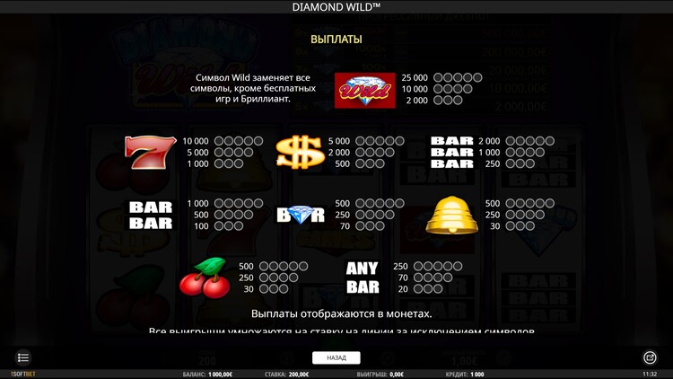 | Бриллиант (Wild) | 2 000 | 10 000 | 25 000 |