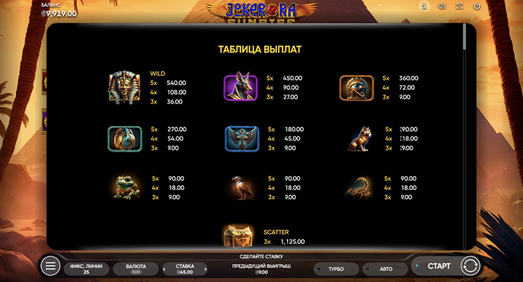 Таблица выплат Joker Ra: Sunrise
