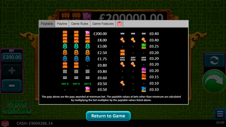 Таблица выплат Ling Chang
