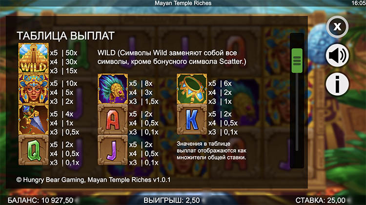 Таблица выплат Mayan Temple Riches