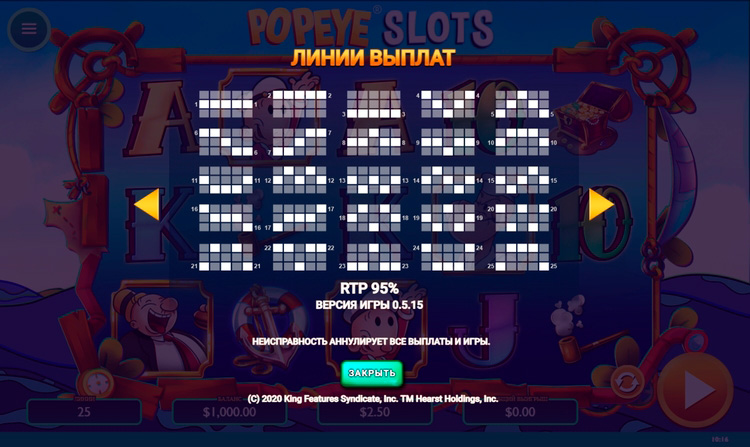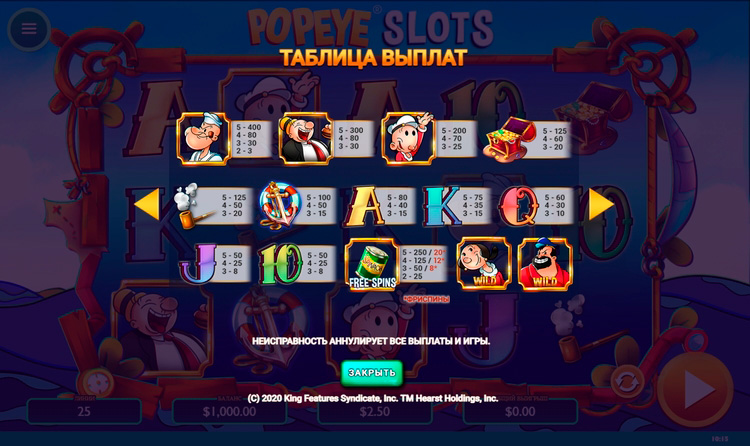 Таблица выплат Popeye Slots