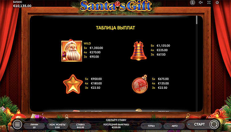 | Дед Мороз (Wild) | 90 | 270 | 1350 |