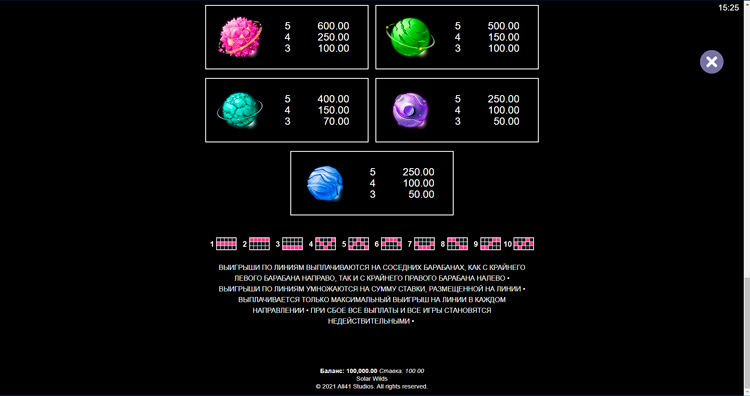Таблица выплат Solar Wilds