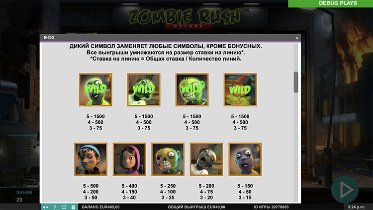 Таблица выплат Zombie Rush
