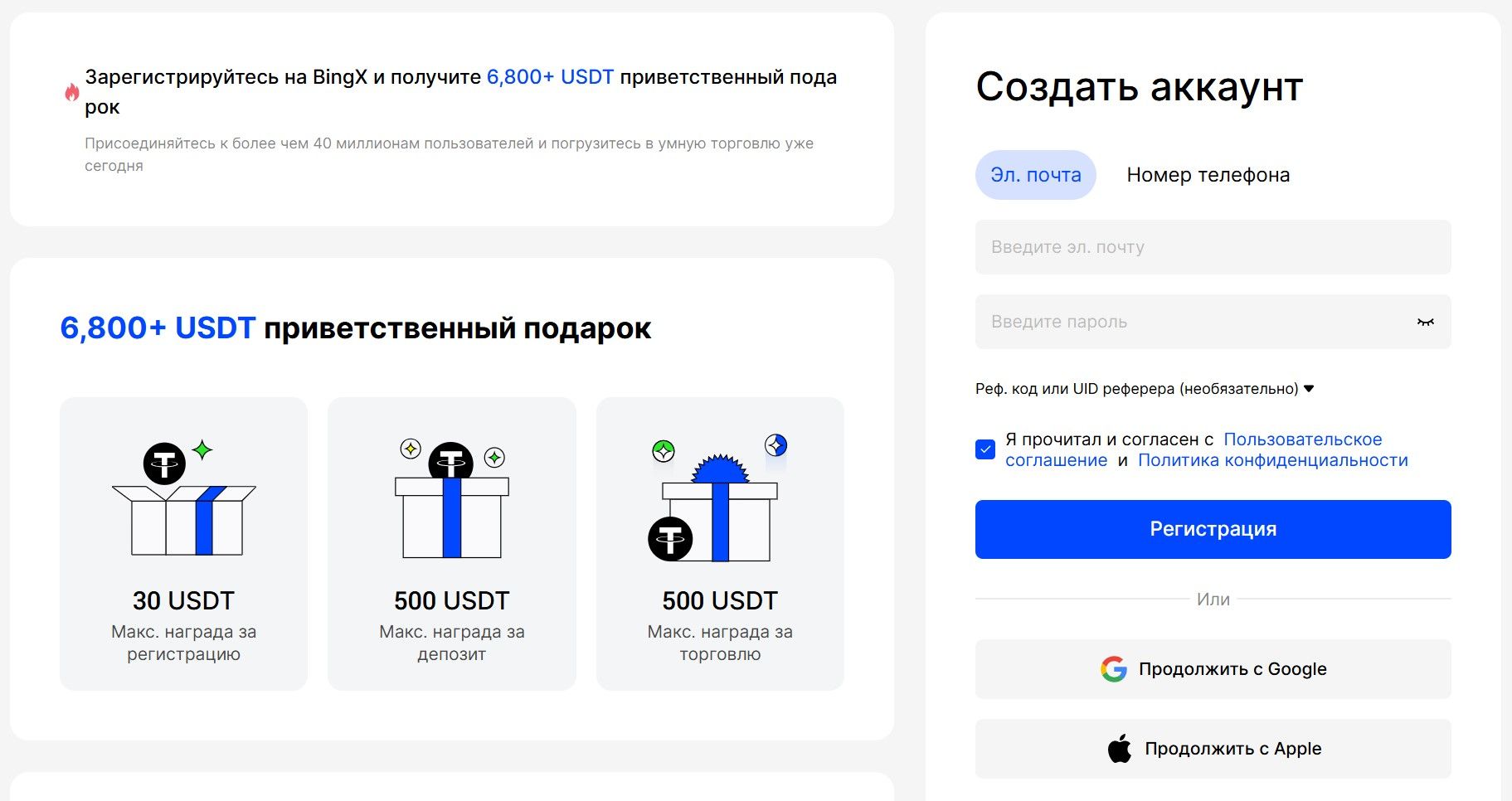 Криптобиржа BingX предлагает щедрую бонусную программу для новых пользователей. При регистрации через партнёрскую ссылку и пополнении депозита от 100 USDT биржа начисляет приветственный бонус 20 USDT на торговый счёт.