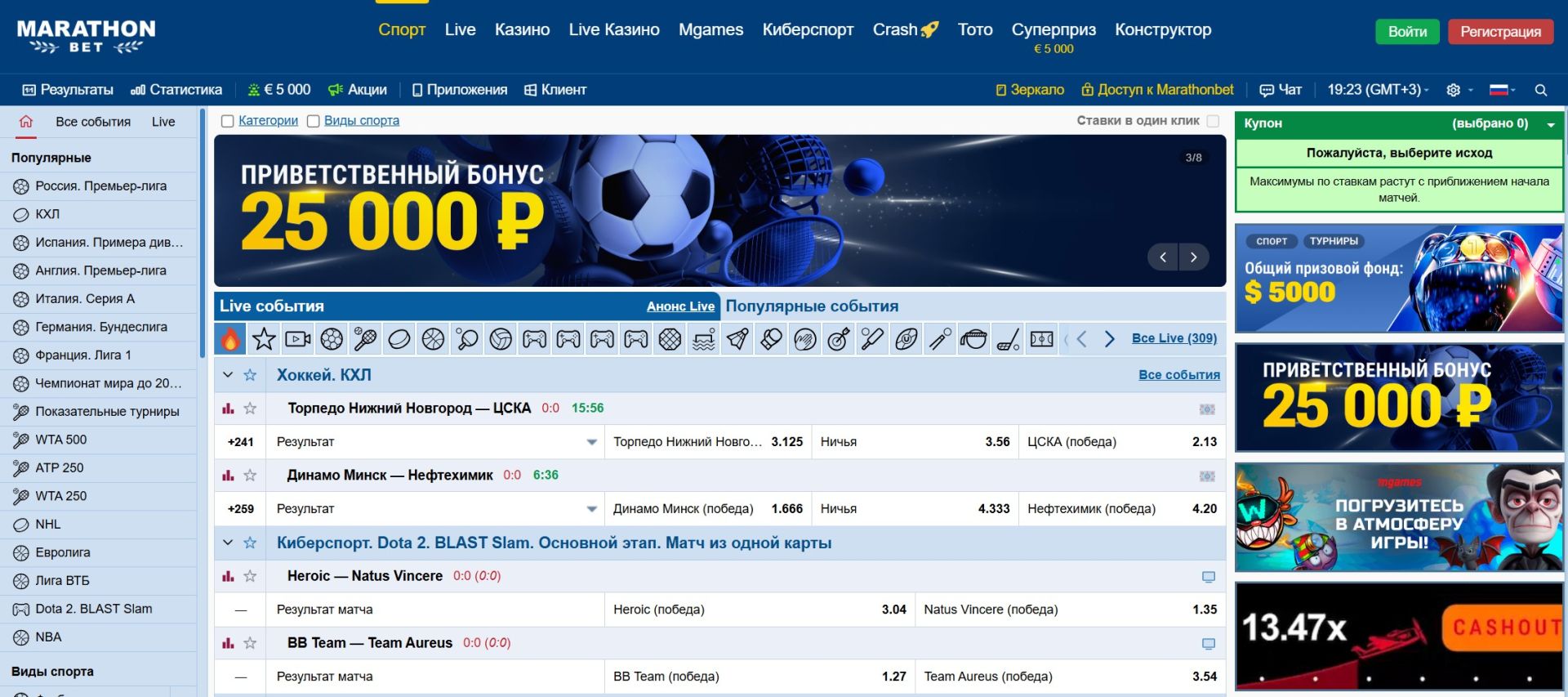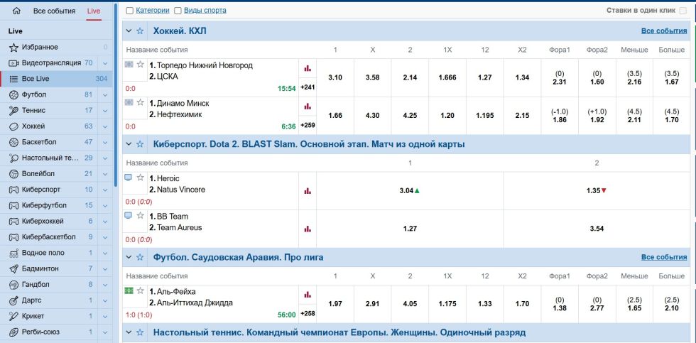 Хоккей — второе по популярности направление для ставок. Континентальная хоккейная лига (КХЛ) и Национальная хоккейная лига (НХЛ) имеют глубокую роспись с возможностью ставок на каждый период, индивидуальные тоталы, дополнительные форы и специальные исходы. Платформа предлагает уникальный рынок «как завершится матч» — в основное время, овертайме или по буллитам.