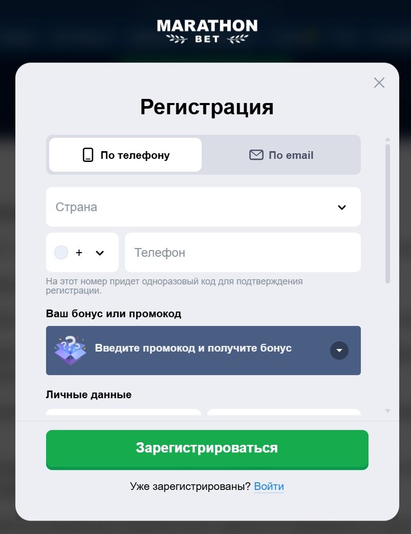- Пройти регистрацию на официальном сайте marathonbet.ru